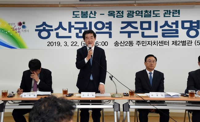 안병용 의정부시장은 3월 21일 신곡1동 행정복지센터, 22일 송산2동 행정복지센터에서 양일간 시.도의원과 주민들 400여 명이 참석한 가운데 7호선 연장 ‘도봉산~옥정 광역철도’와 관련한 주민설명회를 열고, “기본계획 변경을 위해 시민들과 함께 여기까지 왔으나, 관련 법령의 벽을 넘지 못했다”라며 노선 변경 추진이 사실상 어려운 상황임을 설명했다.