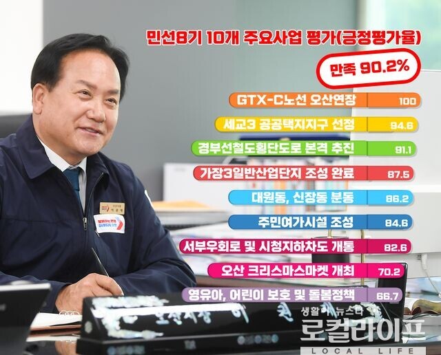 이 시장은 “민선 8기 반환점을 맞은 가운데 오산시민을 대상으로 한 시정운영 및 정책 만족도 조사에서 응답자 중 90.2%가 긍정평가를 해주셨다. 감사하다”며 “GTX-C·KTX 오산정차, 세교3지구·반도체 소부장 유치 등 민선 8기 10개 주요 공약사업에 대한 평가에서 만족도가 높았다”고 말했다.