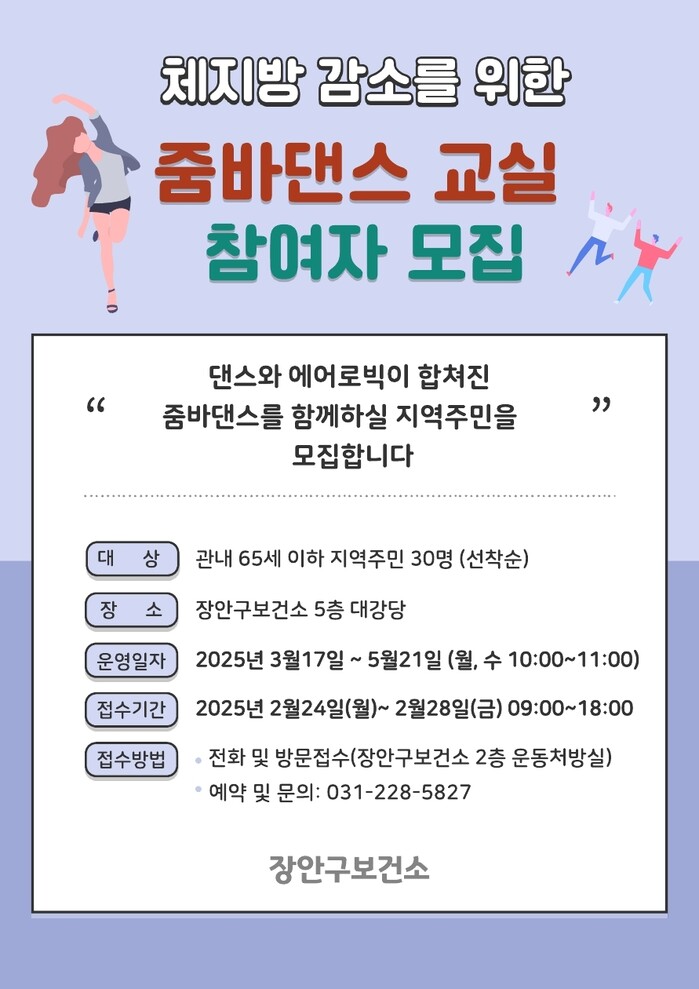 3월 17일부터 5월 21일까지 매주 월·수요일 장안구보건소 5층 대강당에서 줌바댄스 교실을 연다. 프로그램 사전·사후 체성분 측정과 대사증후군(혈압·혈당 등) 검사도 한다.