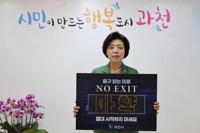 [로컬라이프] 송준형 기자 = 신계용 과천시장은 29일, 주승은 과천경찰서장님의 지명으로 마약근절을 위한 "NO EXIT" 캠페인에 동참했다.