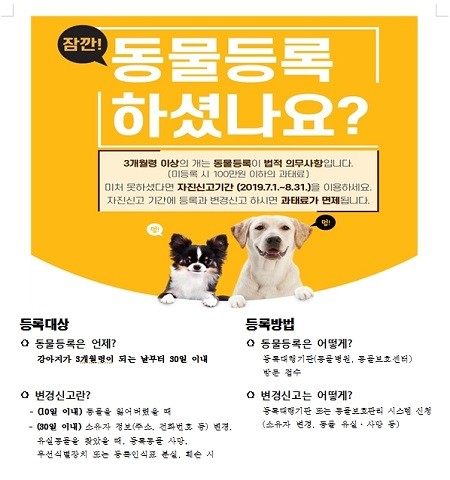 이번 자진신고 기간 안에 반려동물을 등록하거나 등록된 반려동물의 변경 정보를 신고하면 과태료가 면제된다. 시는 자진신고 기간 이후인 9월부터는 반려동물 미등록자, 정보변경 미신고자를 집중 단속할 계획이다.