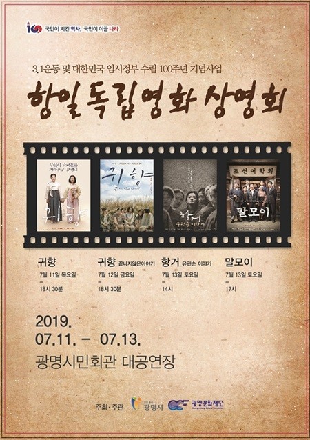 광명시와 광명문화재단은 3.1운동 100주년을 기념해 ‘광명시 항일독립영화 상영회’를 개최할 예정이다. 오는 11일부터 3일 동안 광명시민회관 대공연장과 로비에서 개최 된다.
