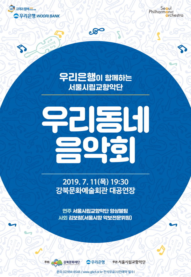 강북문화재단, 우리은행, 서울시립교향악단 주최·주관으로 열리는 이번 음악회에는 서울시향 타악기 앙상블팀이 출연한다. 김보람 서울시향 악보전문위원의 사회로 타악기 수석주자인 에드워드 최를 비롯해 스캇 버다인, 김문홍, 김미연, 이성하 등의 연주자가 실내악 공연을 펼친다.