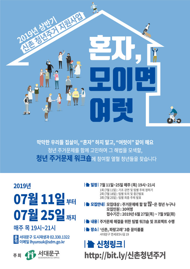 서대문구는 이달 11일과 18일, 25일 저녁 7시부터 9시까지 ‘신촌, 파랑고래’ 3층 꿈이룸홀에서 청년 주거문제 워크숍 ‘혼자, 모이면 여럿’을 개최한다.