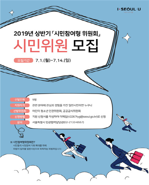 시민 위원에 응모를 희망하는 시민은 ‘시민 위원 지원서’를 작성해 담당자 전자우편으로 신청 접수하면 된다. 모집 기간은 2019년 7월 14일까지이며 관련 분야에 관심과 경험을 갖춘 만 20세 이상의 서울시민이면 누구나 지원 가능하다.