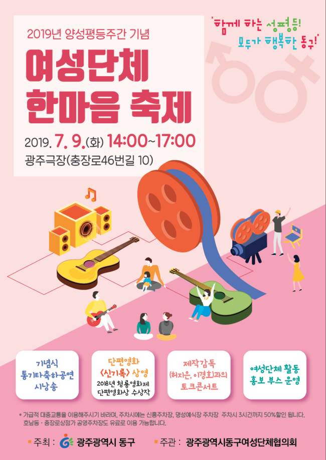 광주 동구가 2019년 양성평등주간을 맞아 오는 9일 광주극장에서 ‘함께하는 성평등 모두가 행복한 동구’를 슬로건으로 ‘여성단체 한마음축제’를 개최한다고 밝혔다.
