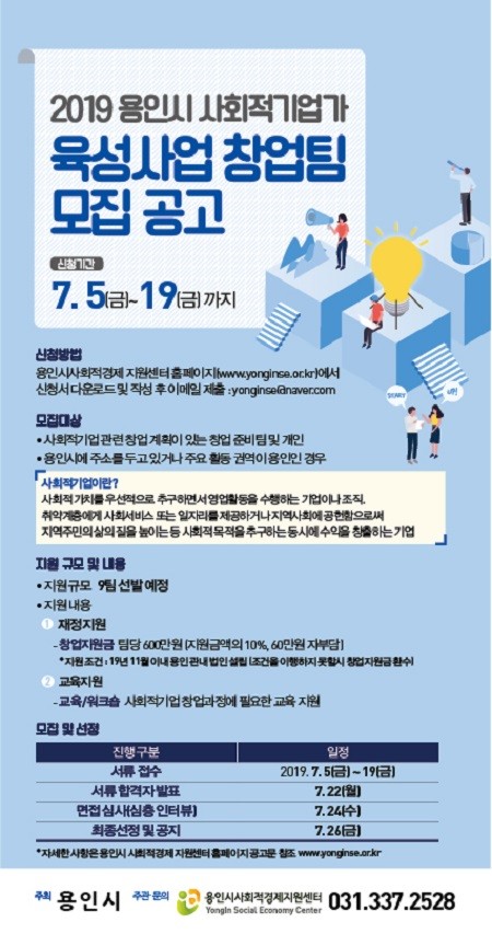 용인시는 5일~19일 지역 사회문제 해결에 기여하는 사회적 기업가 육성사업에 참여할 창업팀을 모집한다.