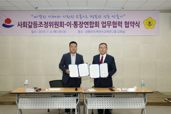 강릉시 사회갈등조정위원회는 강릉시 이·통장연합회와 4일 강릉단오제전수교육관에서 따뜻한 지혜와 시원한 소통으로 행복한 강릉 만들기를 위한 상호 업무협약을 체결하고 민관협력을 통한 갈등관리 거버넌스를 강화했다.