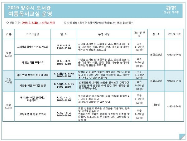 양주시 도서관은 여름방학을 맞아 관내 초등학생을 대상으로 진행하는 여름독서교실 프로그램 수강생을 선착순으로 모집한다.