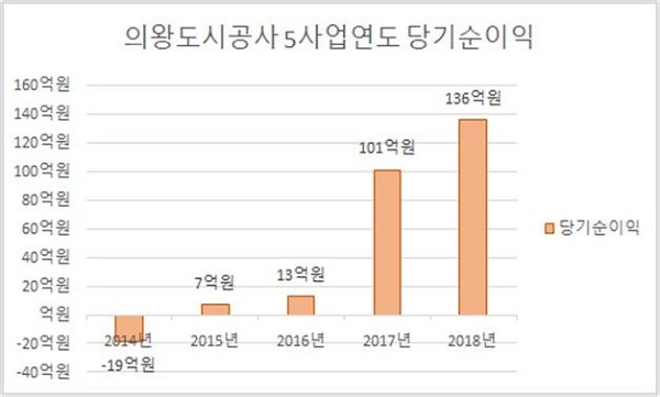 의왕도시공사는 지난 2015년 7억 137만원의 첫 흑자를 기록한 이래 2016년 13억 5,500만원, 2017년 101억 3,605만원을 달성하는 등 4년 연속 당기순이익 증가 행진을 이어가고 있다.