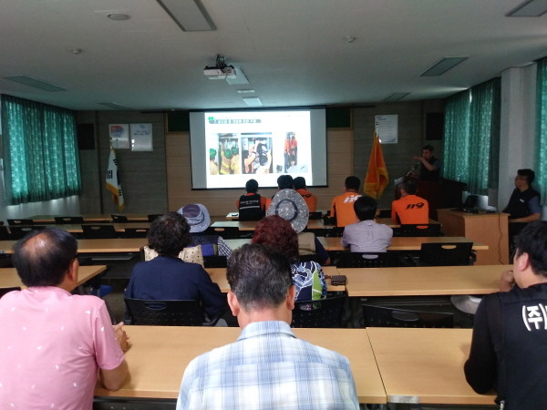캠페인 참여자가 밀양소방서에서 승강기 사고예방 교육을 받고 있다.