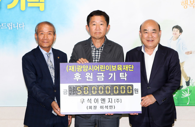 광양시는 우석이엔지 이석만 회장이 지난 4일 광양시청 접견실에서 광양시어린이보육재단에 5천만 원을 기탁하며 따뜻한 마음을 전했다고 밝혔다.