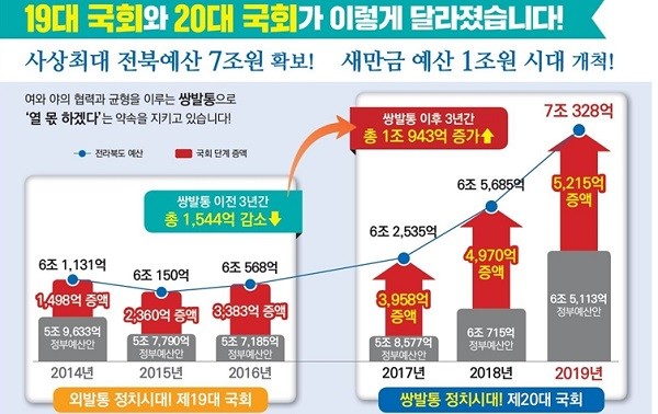 종합해보면, 19대 국회와 20대 국회의 예산 차이가 확연한 것이다. 19대 국회는 ’14년 기준 총 1,544억 원이 감소됐지만, 20대 국회는 ’17년 기준 총 1조 943억 원이 증가한 것이다. 정운천 의원은 앞서 지역 의정활동보고 등을 통해 “전주시민들께서 지역장벽을 깨고 보수정당의 의원을 당선시켜 주시며 전북이 여당과 야당의 협력이 가능한 쌍발통 구조가 됐기에 가능한 결과였다”고 설명한 바 있다.