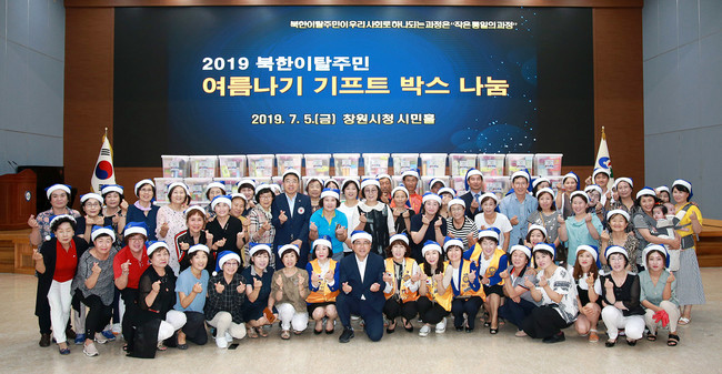 창원시는 5일 시청 시민홀에서 북한이탈주민의 안정적 정착과 지역사회의 을 지원하기 위해 탈북민 250가정에 1천만원 상당의 여름나기 기프트박스 나눔 행사를 진행했다고 밝혔다.