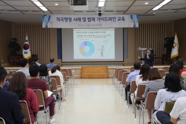 이번 적극행정 사례교육은 인사혁신처 위촉 강사인 이형복 강사를, 적극행정 법제 가이드라인 교육은 법제처 김한율 법제관을 초빙해 진행됐다.