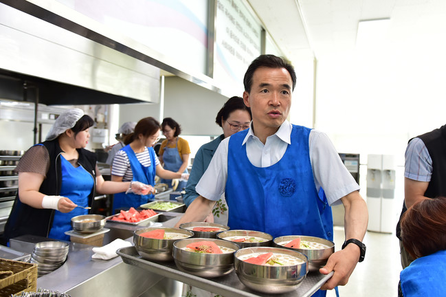 이항진 여주시장이 민선 7기 취임 1주년을 맞아 시정 현안을 살피고 있는 가운데, 지난 6일 여주시 장애인 복지관을 찾아 토요무료급식 배식 봉사를 실시했다.