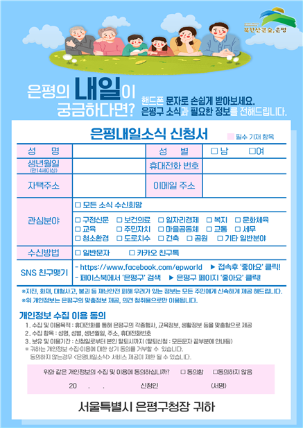 ‘은평내일소식’ 신청방법은 온라인 홈페이지나 동 주민센터에서 신청할 수 있으며, 은평구 주민 뿐만 아니라 은평구에 거주하지 않는 주민들도 신청 가능하다.