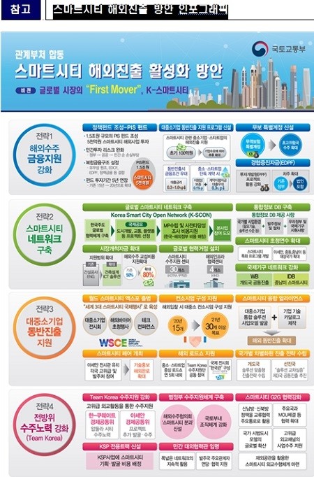 한국은 20년 이상의 신도시 개발경험과 초고속 정보통신망, 도시통합 운영센터 등의 ICT 인프라가 세계적 수준으로 스마트시티 분야에서 글로벌 경쟁력을 확보하고 있으나, 해외진출을 위한 체계적인 지원방안이 부재했던 것도 사실이다.