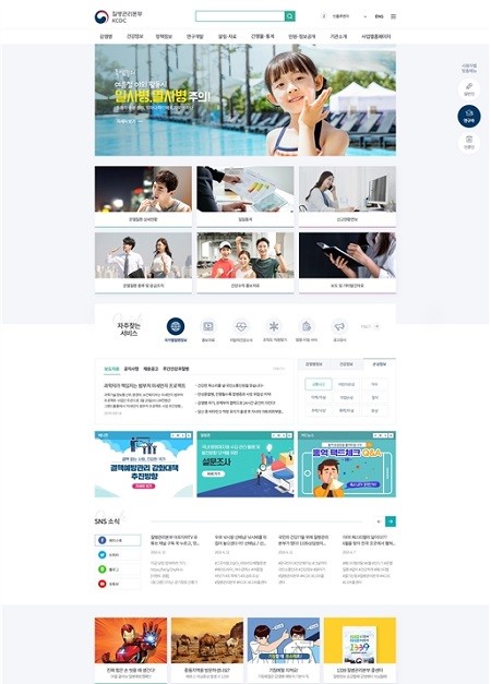 새로운 대표 누리집은 메뉴구조를 이용자 관점으로 전면 개편하고, 감염병 발생 시 신속한 정보 제공을 위해 감염병 정보 및 예방 수칙을 누리집 첫 화면 위쪽에 배치했다.