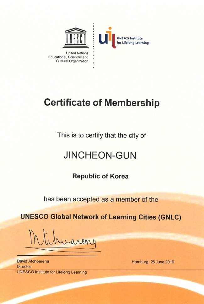 국내 14개 도시가 가입 신청을 했고 서류 및 면접심사를 거쳐 평생교육 전담기구에 추천한 결과 진천군을 포함한 3개 도시가 최종승인을 받았으며 진천군은 충북 유일의 유네스코 학습도시가 되는 쾌거를 이뤘다.