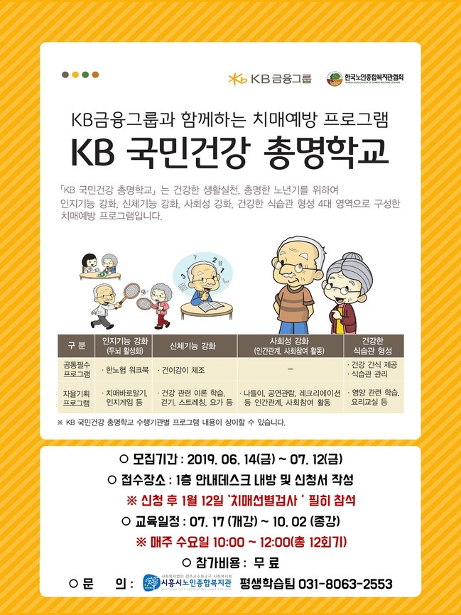 시흥시노인종합복지관은 시흥시에 거주하는 어르신들이 건강한 노년을 보낼 수 있도록 치매예방 프로그램을 제공하는 'KB국민건강 총명학교 [똑똑마켓]' 를 오는 17일부터 10월 2일까지 진행한다.