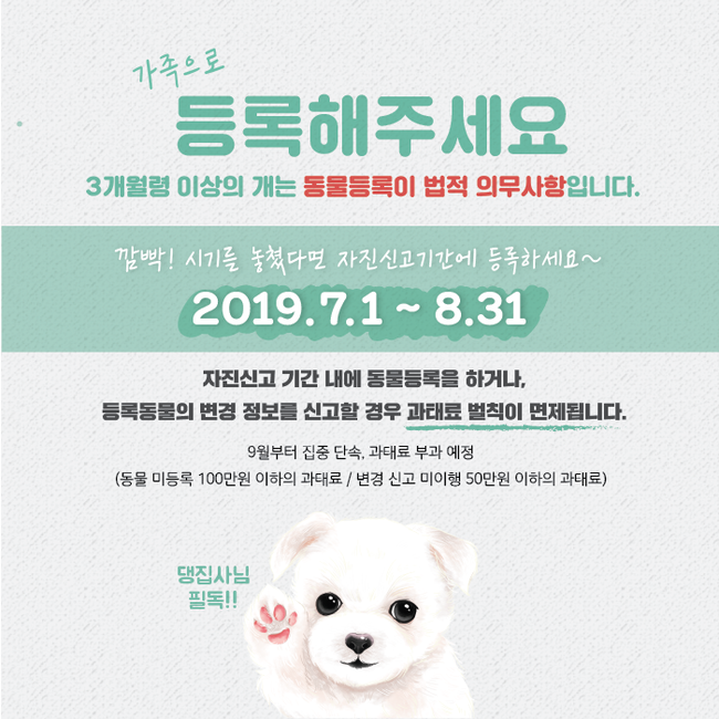 자진신고 기간은 지난 1일부터 오는 8월 31일까지 한시적으로 운영되며, 2020. 3월부터는 2개월령 이상의 개로 등록 대상이 확대된다.