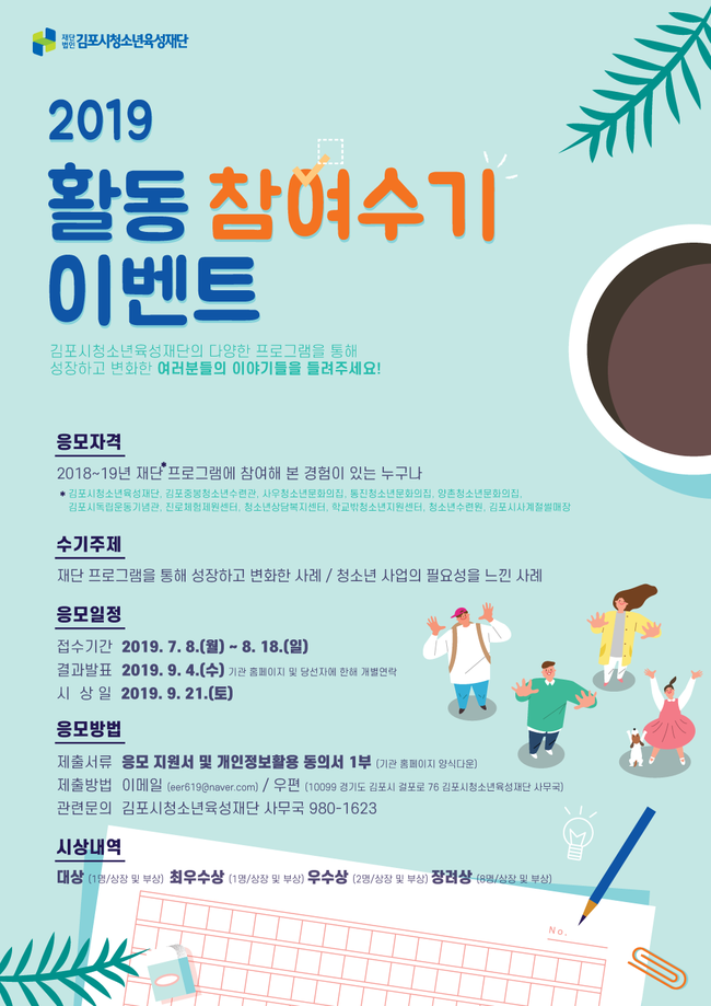 김포시청소년육성재단은 지난 8일부터 오는 8월 18일까지 ‘2019년 활동 참여수기 이벤트’를 개최한다.