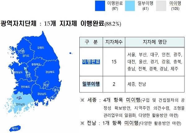 17개 광역자치단체 중에서는 서울특별시, 경기도 등 15개 지자체가 이행을 완료하고 세종특별자치시와 전라남도는 일부만 이행했다.
