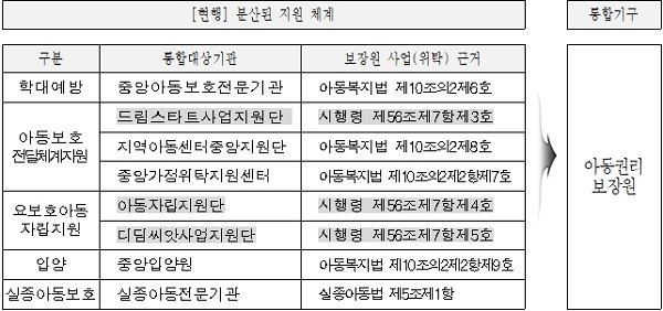 아동복지법 개정 시 별개의 기관에서 운영되고 있는 아동서비스 지원업무를 아동권리보장원으로 통합하기로 했다.