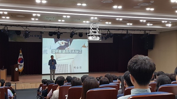 백승권 강사는 매년 200여 차례 글쓰기 강연을 하고 있는 보고서 작성법의 전문가로 이날 특강에서 ‘보고서’는 대통령부터 말단 공무원까지 소통 언어이며 조직의 기록이자 역사가 되어야 한다고 강조했다.