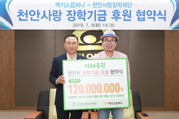 맥키스 컴퍼니와 천안사랑장학재단이 지난 9일 시청 소회의실에서 장학기금 후원을 위한 업무 협약을 체결했다.