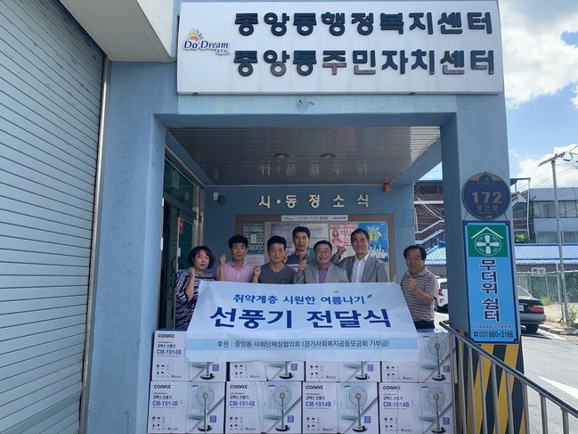 점차 더워지는 여름 날씨에 주거환경이 좋지 못해 더위로 고생하는 소외계층이 여름을 시원하게 날 수 있도록, 중앙동 사회단체장협의회가 뜻을 모아 경기 공동모금회에 후원금을 기탁했고, 기탁된 후원금은 취약계층 시원한 여름나기 사업비로 중앙동 지역사회보장협의체에서 교부받아 사업을 진행하게 됐다.
