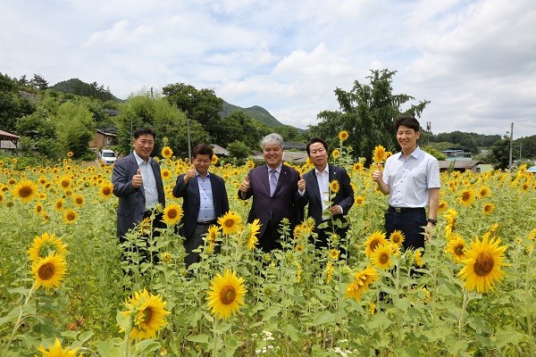 문정우 금산군수는 지난 9일 관계자들과 함께 금산읍 양지2리 와정마을에 조성된 해바라기 꽃밭을 둘러보며 현장행정을 펼쳤다.