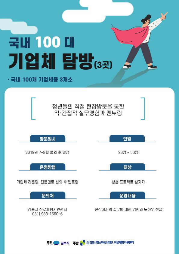 김포시청소년육성재단 진로체험지원센터는 8월 중 청년들의 자존감 향상 및 안목을 넓힐 수 있는 ‘청년 프로젝트 3단계-국내 기업체 탐방’을 위한 대상 기업을 모집한다고 밝혔다.