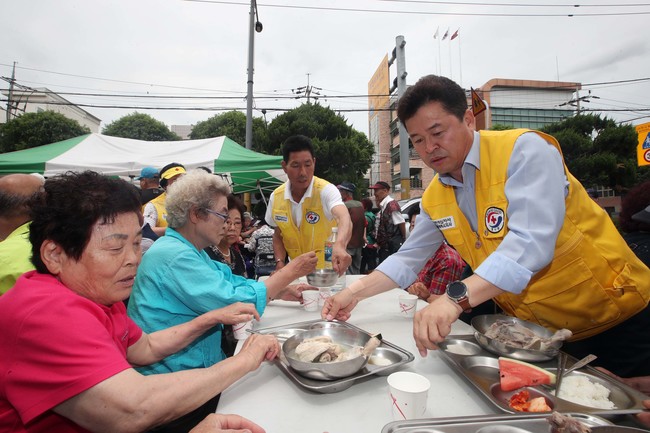 허인환 동구청장과 박양근 대한적십자사 동구지구협의회장 및 적십자회원 등 40여명이 참여한 가운데 진행된 이날 나눔 행사에서는 이동급식 차량을 이용해 정성껏 마련한 삼계탕 500인분을 대접했다.
