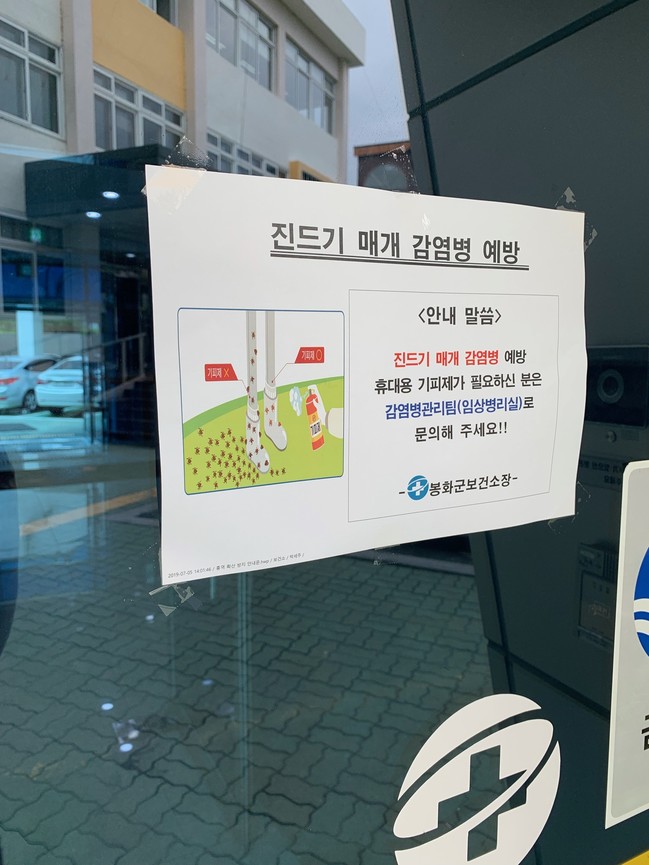 봉화군보건소는 올해 1월 농한기부터 마을회관을 통한 주민 교육을 시행했고, 주요 공원 현수막 게첨, ‘1가구 1기피제’ 및 예방 토시 배부,읍면사무소 출입구 10곳에 ‘해충 기피제 분사기’설치, 지역 농협 해충 기피 약품을 지원하였으며, 앞으로 지역 내 장터와 ‘2019년 봉화은어축제’를 이용한 캠페인을 통해 예방 활동을 더욱 강화 할 계획이다.