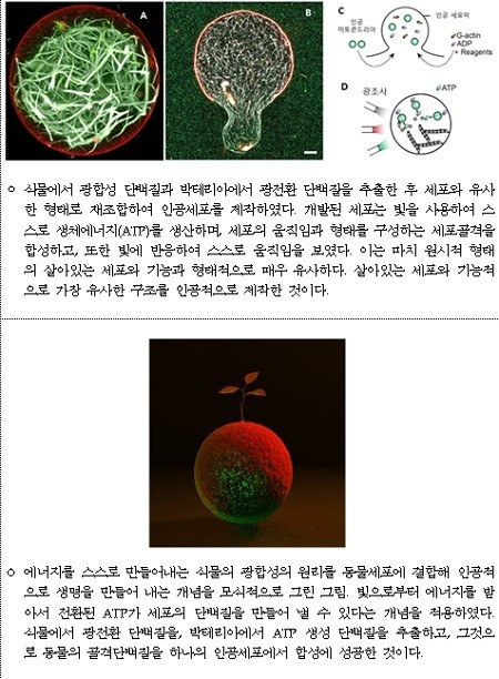 식물의 광합성 단백질과 박테리아의 광전환 단백질을 추출해 스스로 에너지 대사를 할 수 있는 인공 미토콘드리아를 제작했다. 이어 인공 미토콘드리아를 인공세포막에 삽입해 골격단백질을 스스로 합성하며 움직이는 인공세포를 제작했다.