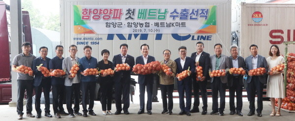 군은 10일 오전 함양농협산지유통센터에서 함양양파 첫 베트남 수출 선적식을 가졌다.