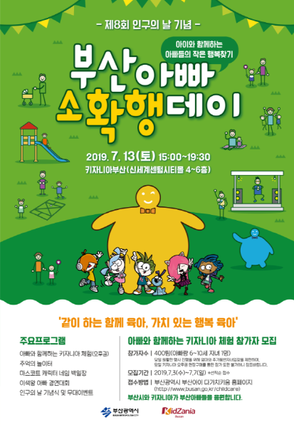 부산시는 오는 13일 신세계 센텀시티몰에 위치한 ‘키자니아 부산’에서 제8회 인구의 날을 기념한 ‘2019 부산아빠 소확행 데이’ 행사를 개최한다고 밝혔다.