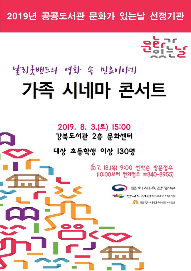 공주시 강북도서관은 오는 8월 3일 강북도서관에서 ‘공공도서관 문화가 있는 날’ 일환으로 ‘가족 시네마 콘서트’를 운영한다고 밝혔다.