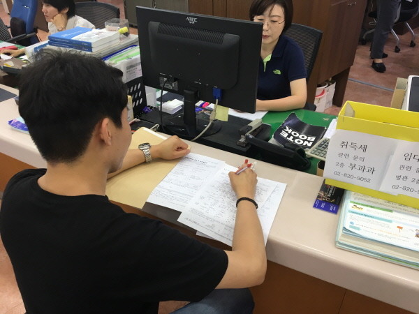 민원인이 구청 부동산정보과에서 부동산 관련 신고를 하고 있다.