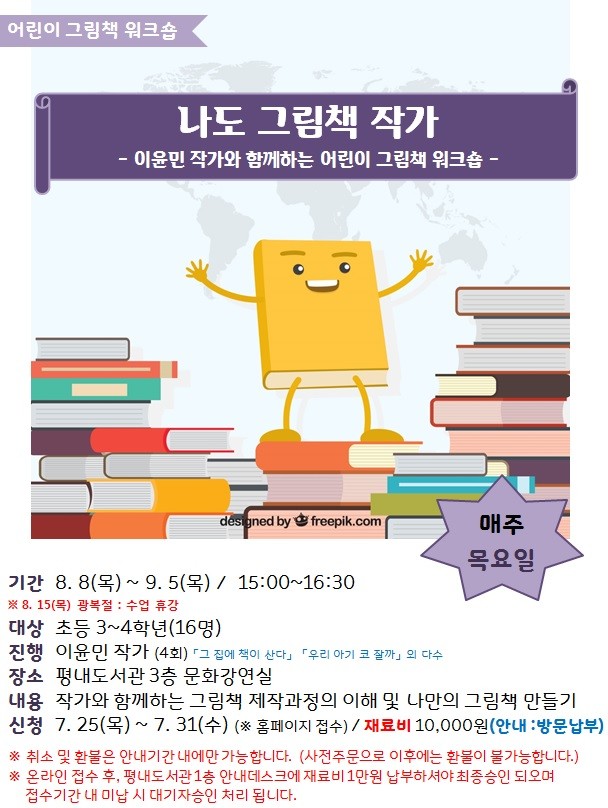 남양주시는 오는 8월 8일부터 9월 5일까지 평내도서관에서 이윤민 작가와 함께하는 그림책 워크숍 ‘나도 그림책 작가’를 운영한다.