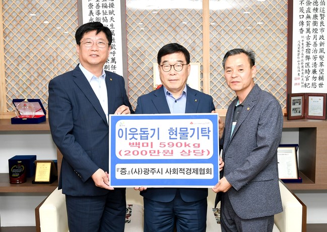 광주시 사회적경제협회는 11일 광주시를 방문해 관내 어려운 이웃에게 전달해 달라며 백미 590㎏을 기탁했다.