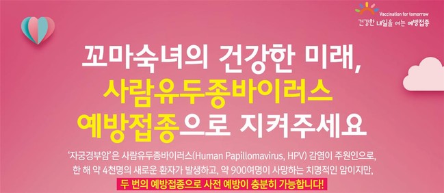사람유두종바이러스는 생식기 감염을 일으키는 바이러스로 지속적인 감염 시 자궁경부암 등을 유발시켜 예방접종과 사춘기 성장발달 관련 건강서비스를 6개월 간격으로 2회 무료 제공하고 있다.