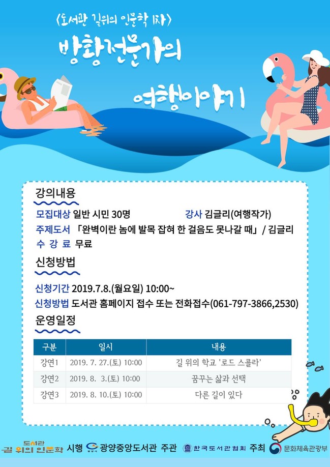 ‘방황전문가의 여행이야기’라는 주제의 ‘길 위의 인문학’ 1차 프로그램은 오는 27일 오전 10시 강연을 시작으로, 8월 3일, 8월. 10일. 총 3차례로 운영되며, 여행 전문 작가인 김글리 작가와 함께 중앙도서관 본관 1층 문화공간 하루에서 진행된다.