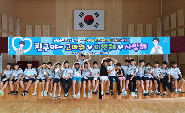 통영시청소년상담복지센터는 학교폭력 예방을 위해 “친구야 미안해·고마워·사랑해”라는 주제로 7월 9일 동원중학교 전교생을 대상으로 좋은친구데이 행사를 진행했다.