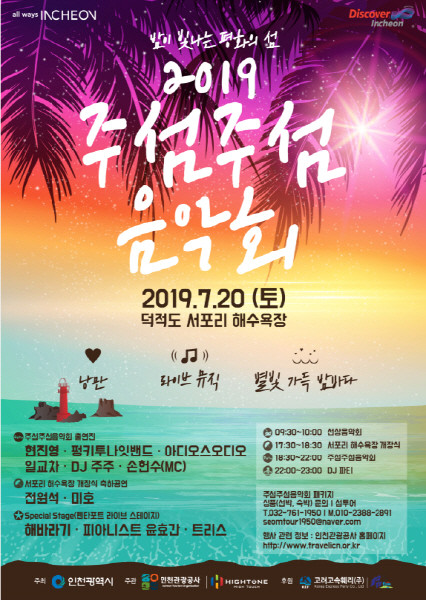 인천광역시와 인천관광공사는 오는 20일 인천의 대표 국민관광지인 덕적도 서포리 해수욕장에서 올해로 4회째를 맞이하는‘2019 주섬주섬 음악회’를 개최한다고 밝혔다.