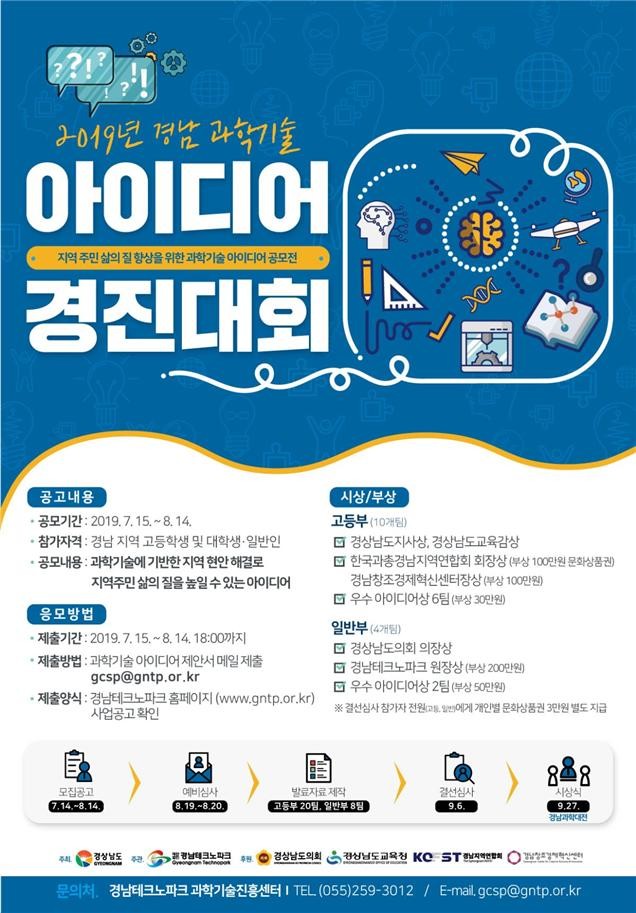 경상남도가 과학기술과 접목가능한 지역의 다양한 문제를 해결하고 지역의 과학문화를 더욱 확산시키고자 경남테크노파크, 경상남도의회, 경상남도교육청과 협력해 ‘2019년 과학기술아이디어 경진대회’를 개최한다.