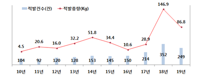 그러나, 올해 상반기 적발실적은 과거 10년간 상반기 실적에 비해 전년에 이어 두번째로 높으며 2017년 동기대비 건수는 16%, 중량은 200% 증가했다.