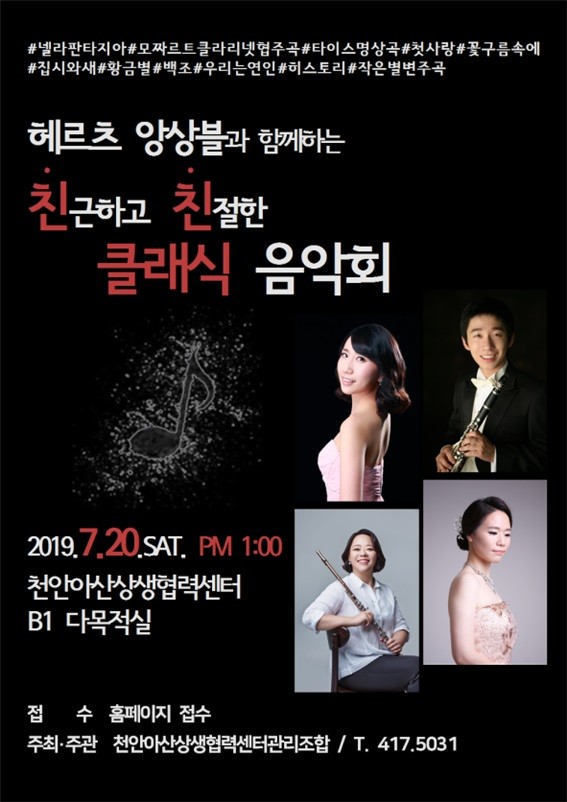 천안아산상생협력센터가 오는 20일 오후 1시 수준 높은 음악을 시민들이 편안하게 누릴 수 있도록 헤르츠 앙상블과 함께하는 ‘친친음악회’를 연다.